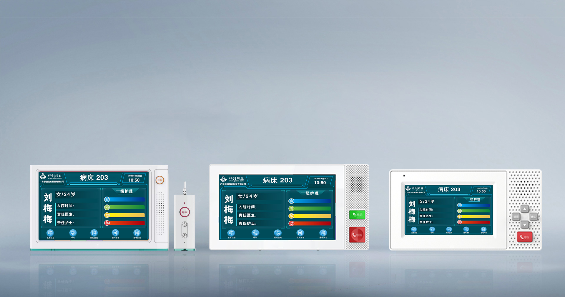采用7寸電容觸摸屏,超薄面板,含手持呼叫手柄,安裝在病床上方的設(shè)備帶上,每個病床一臺,用于呼叫護士站,患者基本信息展示,擴展功能:電子床頭卡、費用查詢、院內(nèi)點餐、視頻點播外接緊急衛(wèi)生間報警按鈕、門燈等。